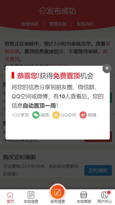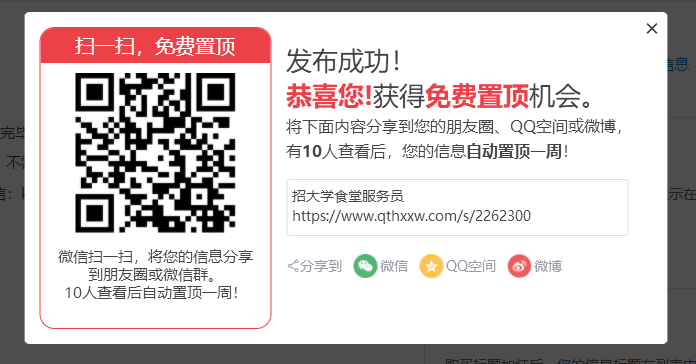 一、下面来说说我们用到的一个方法和效果:用户在我们的网站发布完信息后会得到一个提示按照提示操作即可免费指定。如下图:电脑版的效果手机版的效果用户可以直接分享到微信朋友圈、微信群、也可以分享到QQ空间、